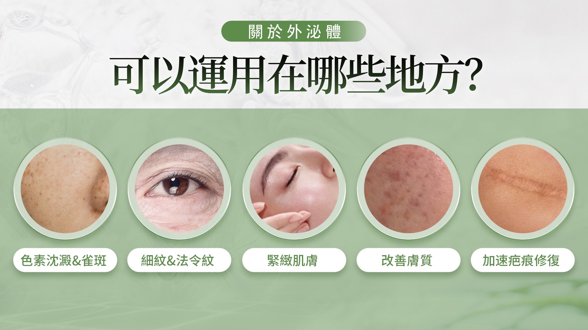 全球市場已見許多含有外泌體的皮膚護理產品,這些產品擁有減輕色斑、細紋,提升皮膚彈性等多重功能,可有效改善膚質、均勻膚色。因此,外泌體的應用已超越單純傷口修復,成為抗衰老產品中的新潮流。