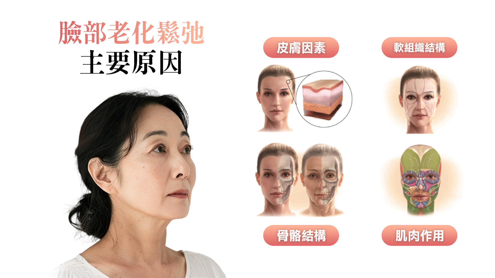 臉部衰老的主要原因涵蓋了皮膚、皮下脂肪和筋膜層因年齡增長而失去彈性以及受到地心引力影響導致的下垂,這些變化會改變臉型並增強下垂的感覺,不良的生活習慣像是吸煙、飲酒和熬夜,也會促進肌膚老化速度。