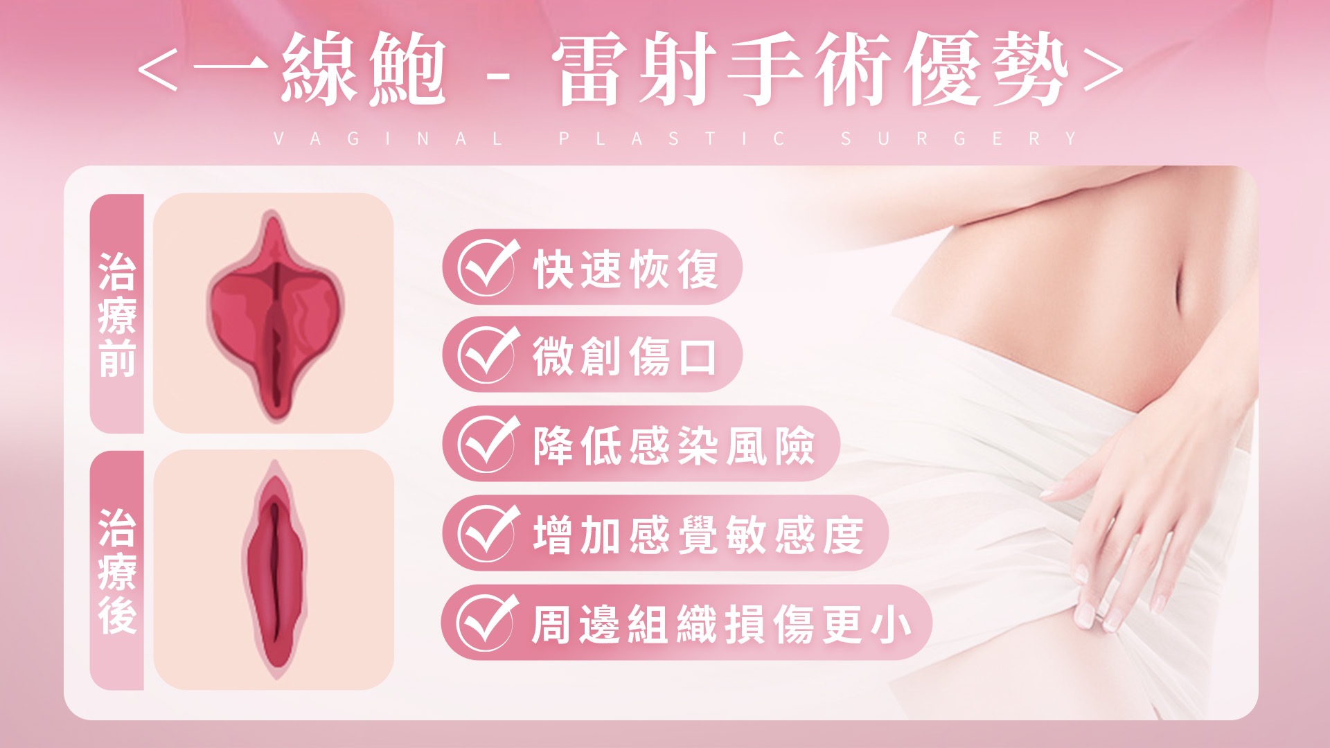 採用雷射和電波技術進行的小陰唇修整手術,損傷小,術後腫脹、疼痛減少,且幾乎不留疤痕。