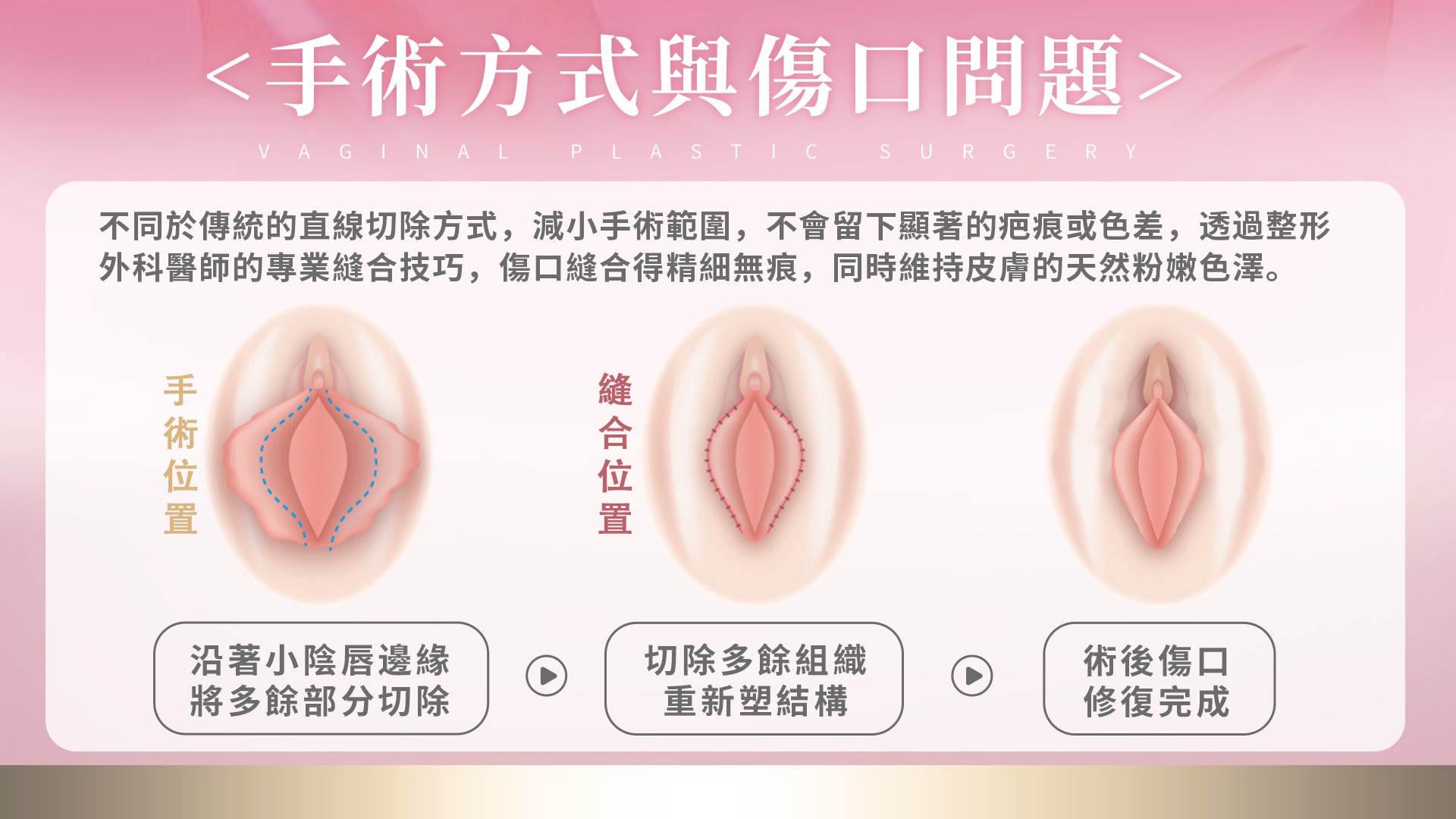 手術涉及小陰唇邊緣的精細切割和縫合,旨在改善對稱性和外觀,傷口通常小且精確。