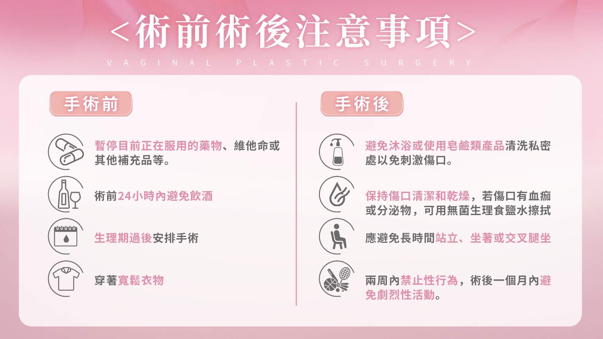 術後兩周內禁止性行為,術後一個月內避免劇烈性活動。
