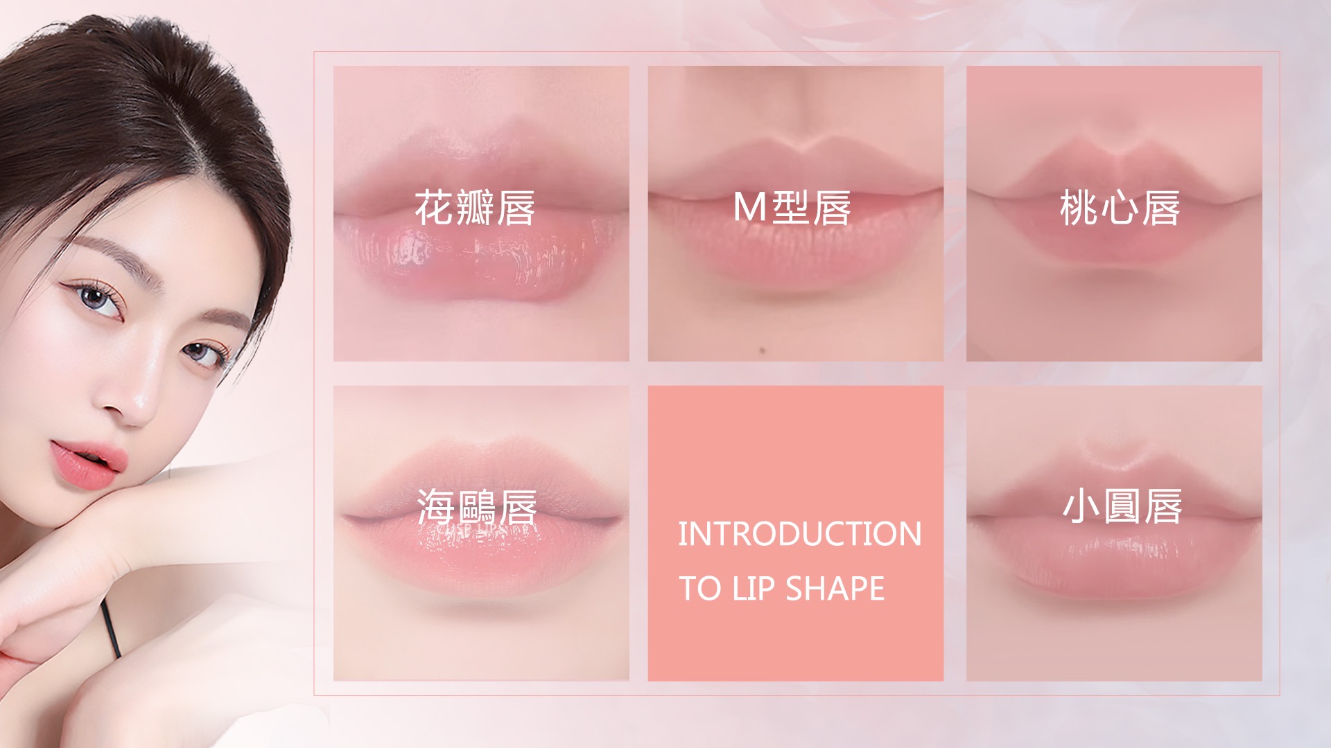 上下唇各有明顯的唇珠,中央的上唇和兩側的下唇皆凸顯出獨特的特徵,兩者之間微微凹陷,彷彿花瓣狀,通常由M型唇、屁股唇及微笑唇組成。