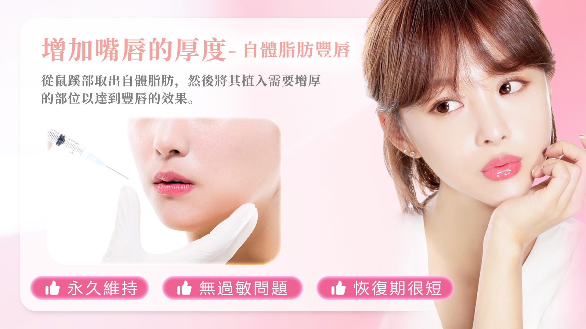 微整形可以使用玻尿酸填充,但效果僅能維持約一年,需要定期注射,另一種方法是進行自體脂肪豐唇手術,也稱為半永久性自體脂肪填充,可以持續十年以上。