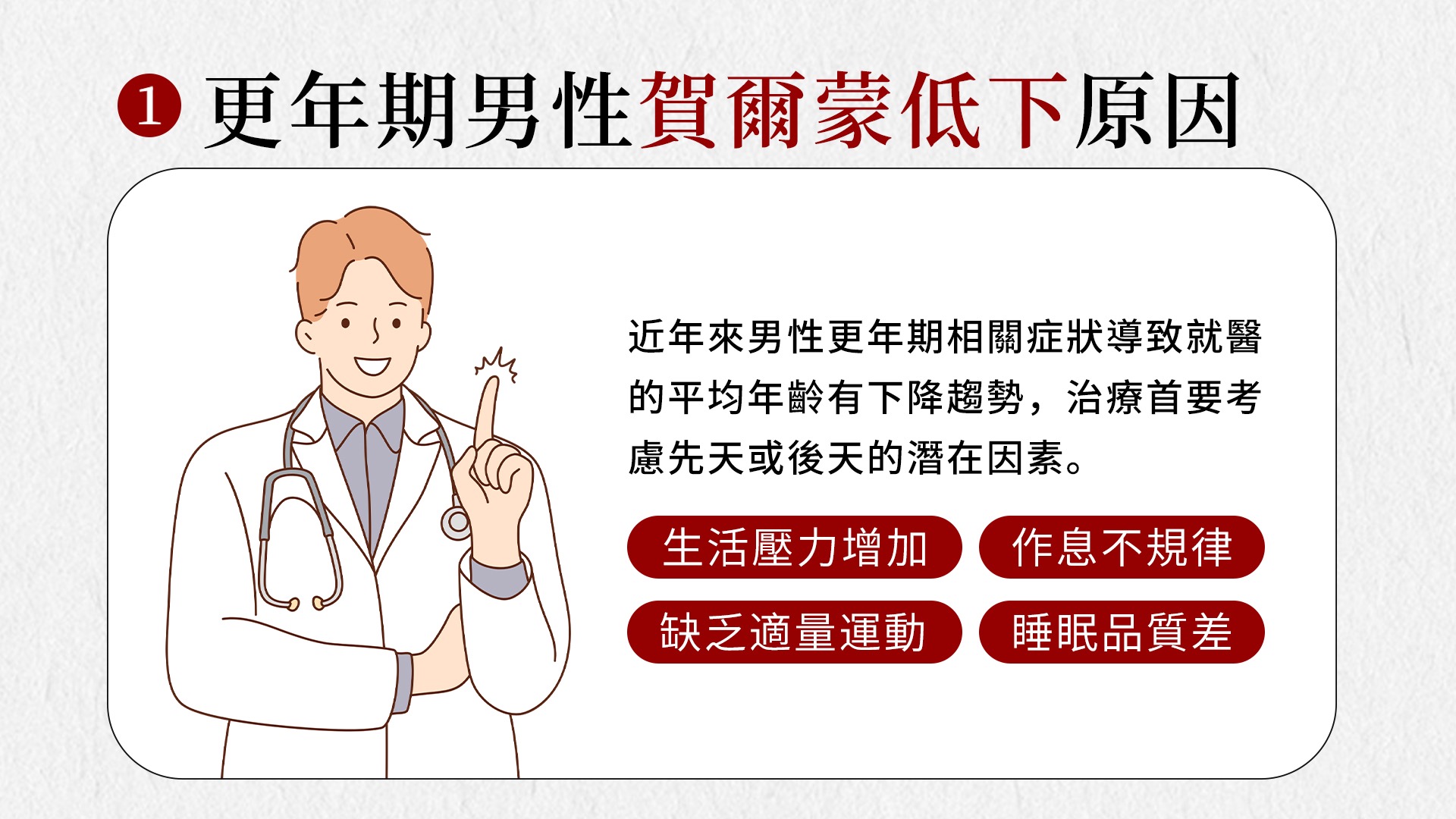 近年來男性更年期相關症狀導致就醫的平均年齡有下降趨勢,這可能與現代人生活壓力增加、作息不規律、睡眠品質差、缺乏適量運動以及代謝性疾病發生年齡提前等因素相關。在臨床診斷出男性性腺功能低下後,治療首要考慮先天或後天的潛在因素,並綜合考慮病人期望、可能存在的系統性疾病等因素討論治療目標,然後根據具體情況制定治療方案。