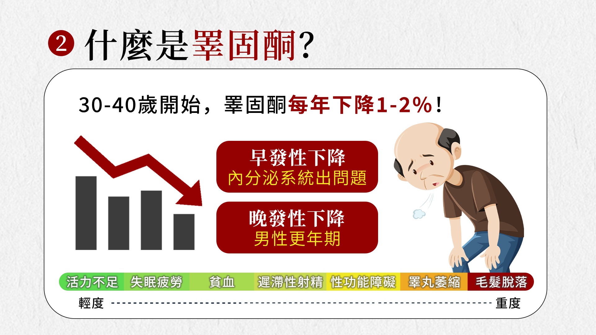 隨著年齡增長,身體狀況自然會隨之老化下滑,這些老化現象可能直接與男性睪固酮分泌量有關,成為影響男性生理活力和心理健康的重要因素,對中老年男性的健康和生活品質產生重大影響。