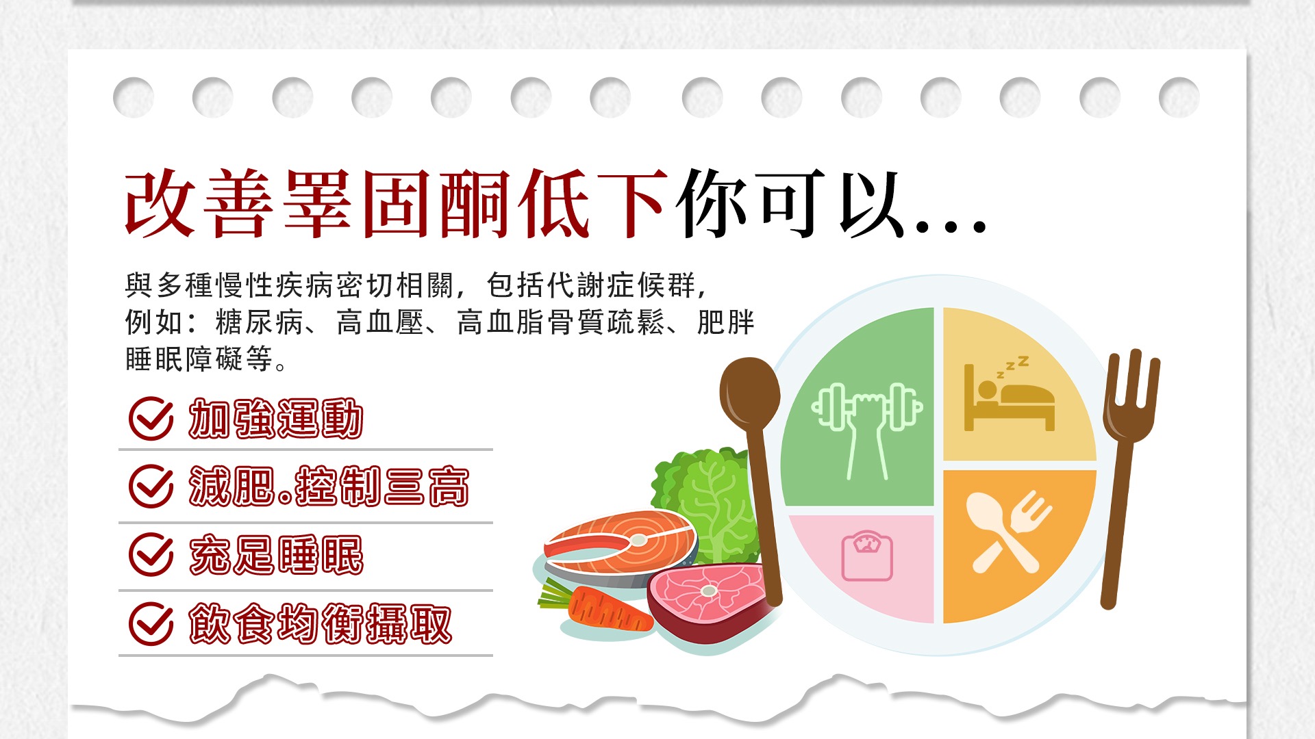 像是過多的脂肪代謝會影響睪固酮水平,而低下的睪固酮又會促使脂肪比例增加,形成難以打破的惡性循環,一項國外研究發現,通過飲食控制使患者體重降低 10% 後,睪固酮水平有望提升,甚至有可能回歸正常水平以上,這些患者需要加強運動、減肥、控制三高、保持充足睡眠,並且飲食均衡攝取也能有助於提升睪固酮水平。