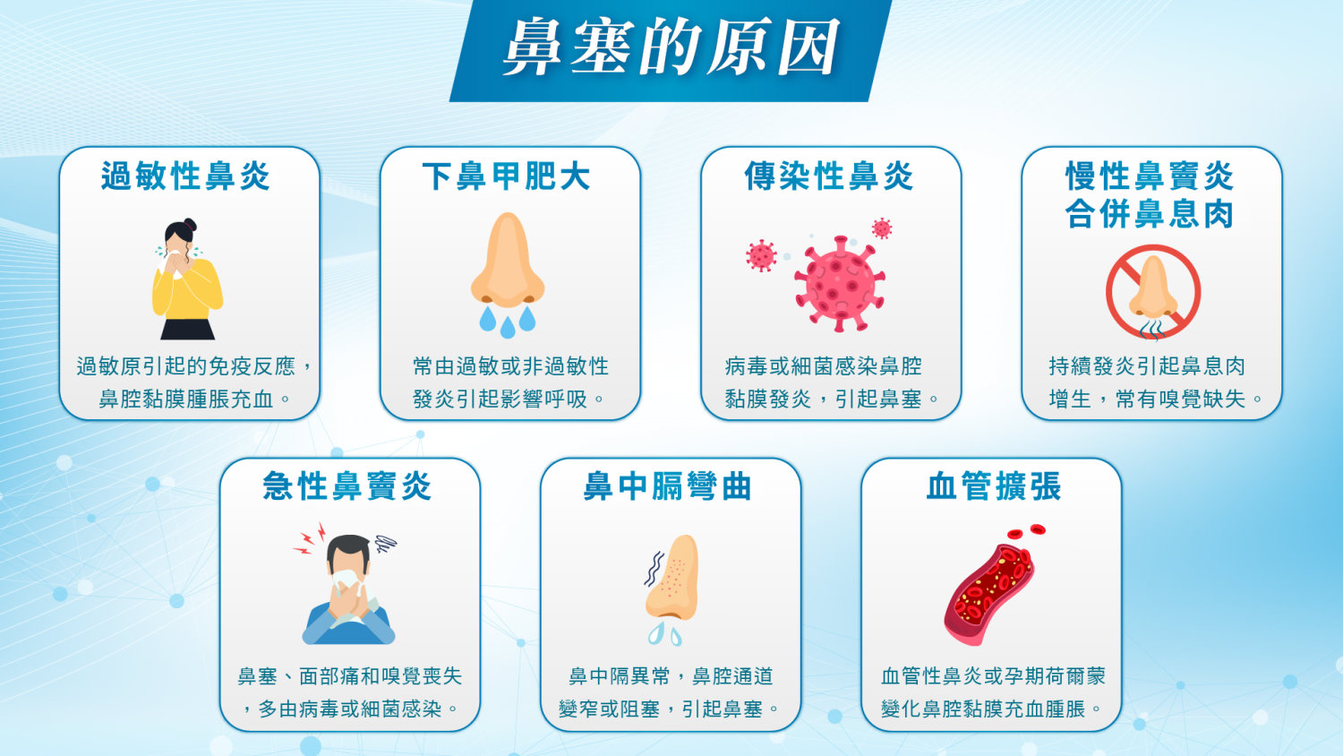 過敏性鼻炎是一種過敏性疾病,通常與季節變化或接觸過敏原有關,其主要症狀之一就是鼻塞,當過敏原像是花粉、塵?等,進入鼻腔時,會觸發免疫系統產生過度反應,導致鼻腔內黏膜腫脹、充血和分泌物增加,進而引起鼻塞症狀的出現。