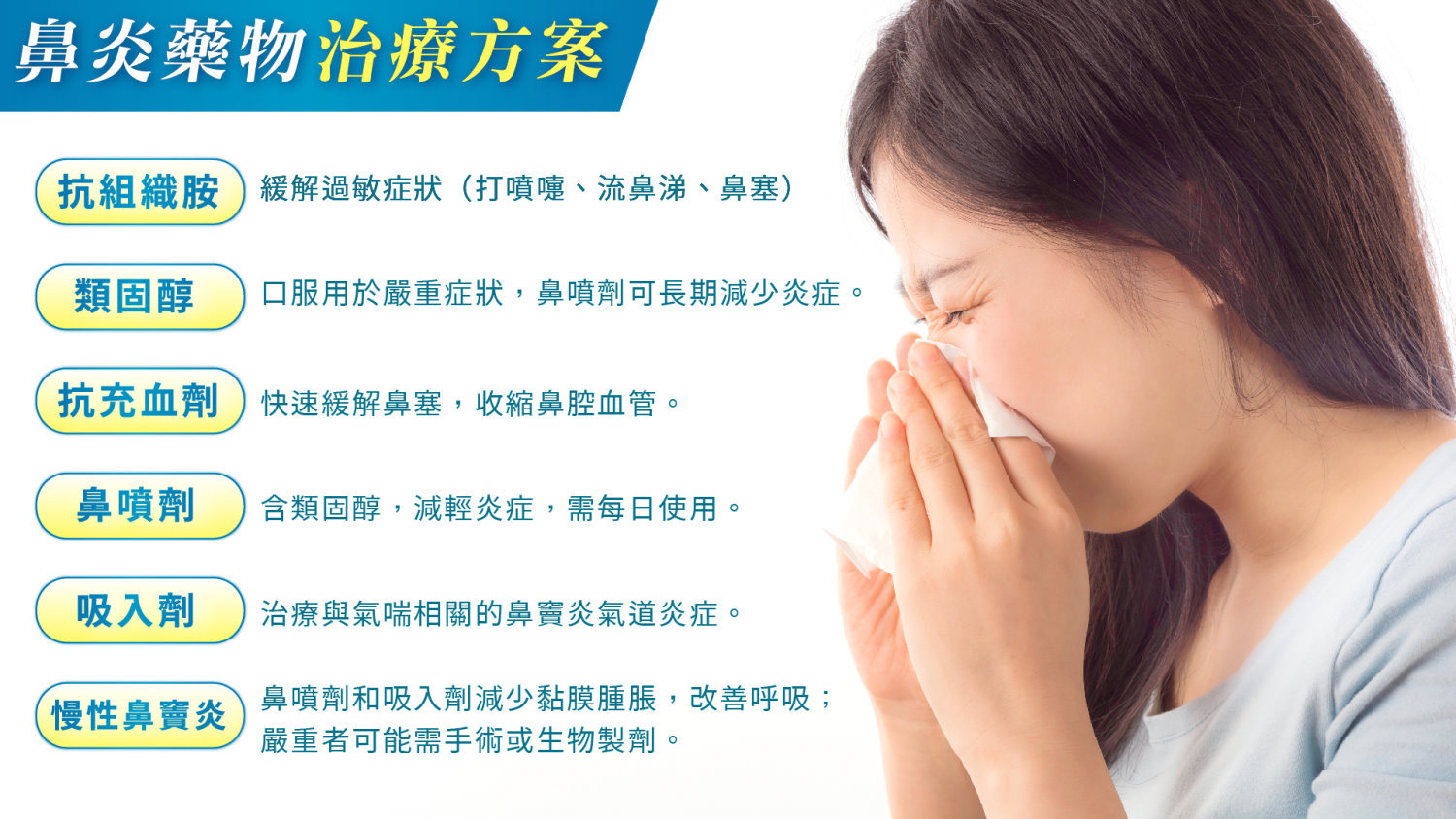 治療鼻炎的藥物包括抗組織胺、類固醇、抗充血劑和其他輔助治療,抗組織胺主要用於緩解鼻炎引起的過敏反應,如打噴嚏、流鼻涕和鼻塞等,可阻斷組織胺的作用,減輕鼻腔黏膜的發炎和腫脹,抗充血劑則用於緩解鼻塞症狀,收縮鼻腔血管,減少血液流量,減輕鼻腔充血和腫脹,儘管這些藥物能快速緩解鼻塞,但長期使用可能產生反彈效應,導致鼻塞惡化。