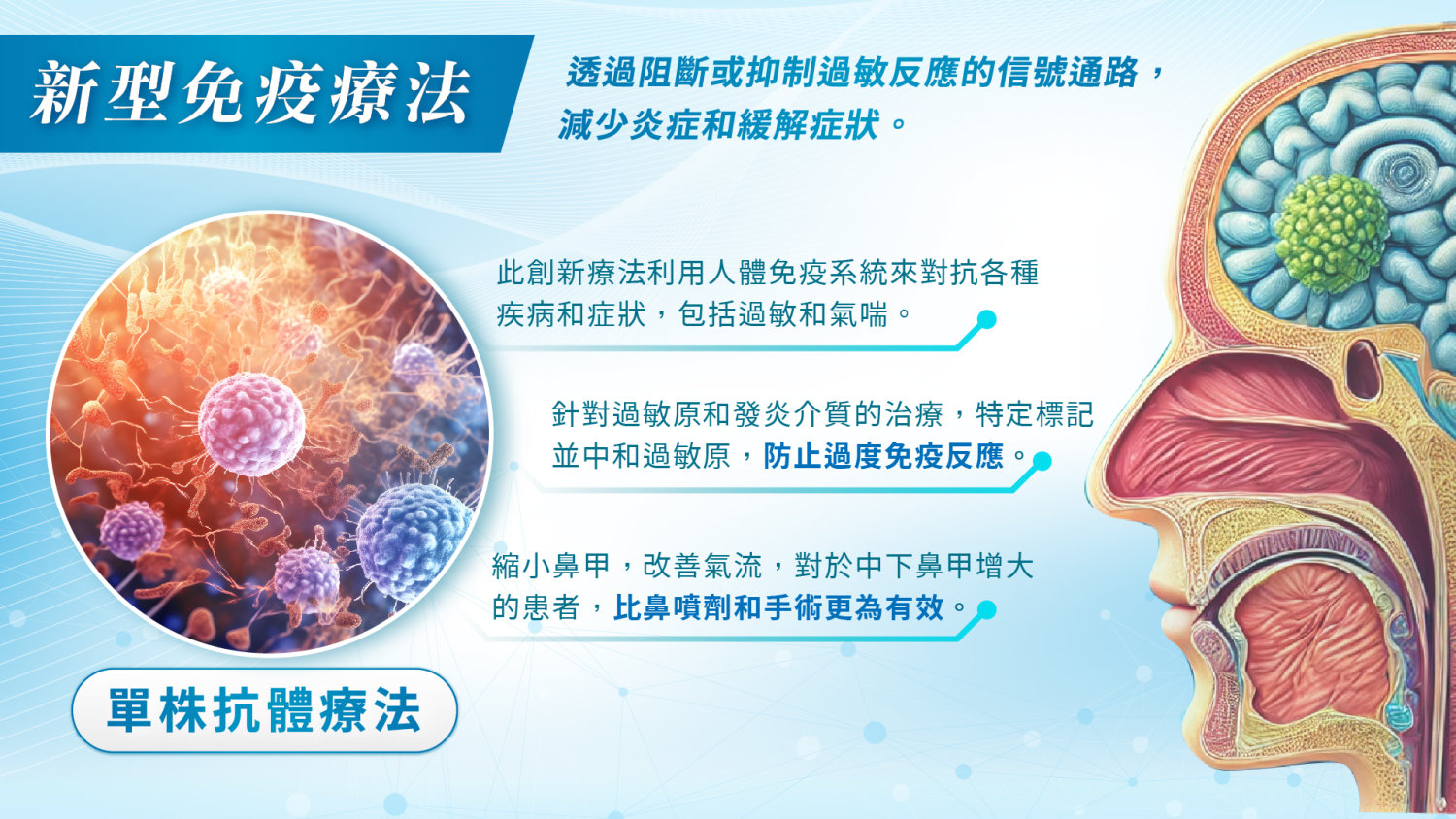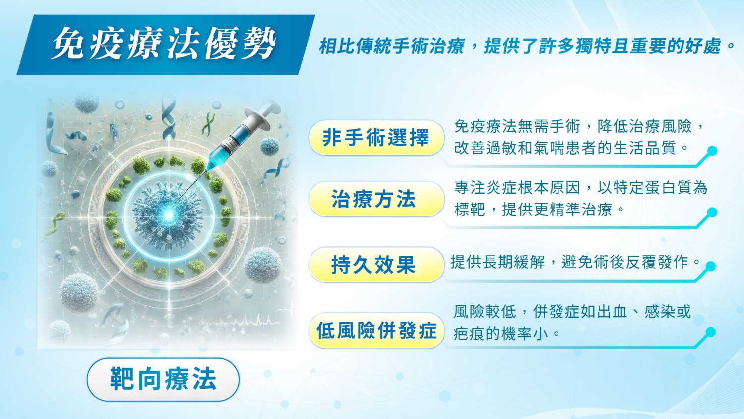 免疫療法是一種無需入侵手術的治療方式,對於因過敏和氣喘導致下鼻甲增大的患者而言,不再只有依賴風險較高的手術以改善生活和睡眠品質。