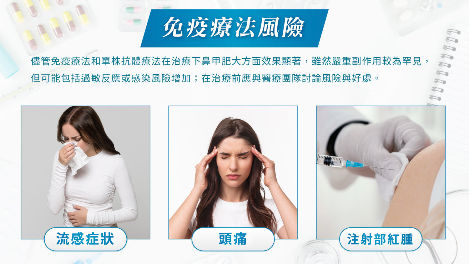 儘管免疫療法和單株抗體療法對治療下鼻甲肥大取得顯著成效,我們仍需瞭解潛在的副作用和風險,一些患者可能出現輕至中度的副作用,例如類似流感的症狀、頭痛或注射部位紅腫,嚴重副作用相對罕見,但可能包括過敏反應或感染風險增加,在開始治療前,患者有必要與提供免疫療法的醫療團隊討論潛在風險和好處。