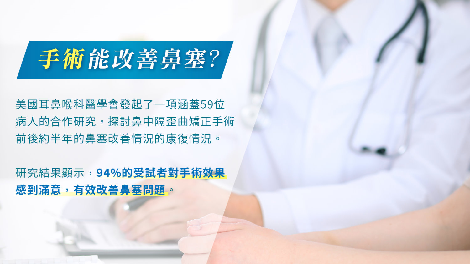 美國耳鼻喉科醫學會曾發起一項跨多家醫院的合作研究,旨在探究鼻中隔歪曲矯正手術後患者的康復狀況,研究結果顯示,在這個涵蓋五十九位病人的研究中,調查了他們在手術前後約半年的鼻塞改善情況,其中高達百分之九十四的受試者對手術效果感到滿意,手術對於緩解鼻塞問題的效果是相當理想的。