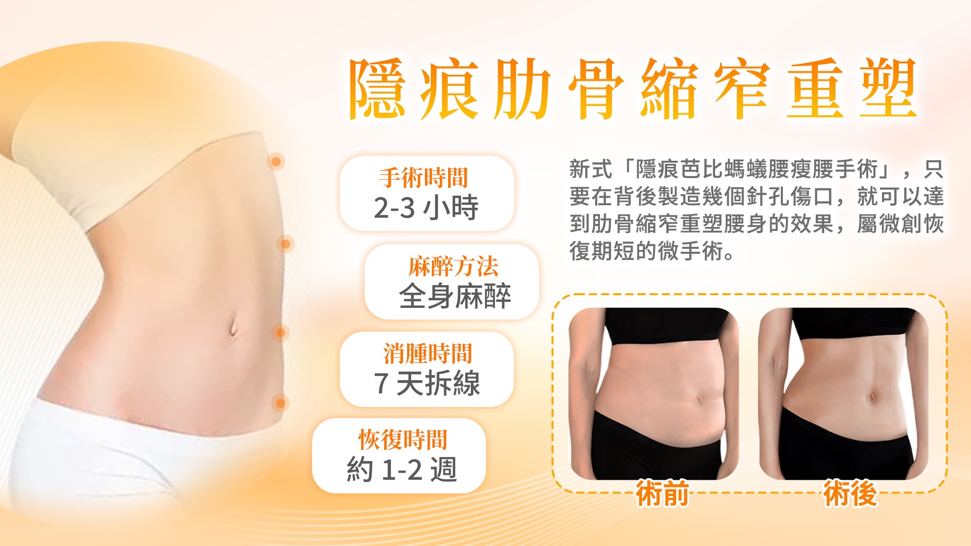 現在新式的「隱痕肋骨縮窄重塑」隱痕芭比螞蟻腰瘦腰手術,只要在背後製造幾個針孔傷口,就可以達到肋骨縮窄重塑腰身的效果,屬微創恢復期短的微手術 ~