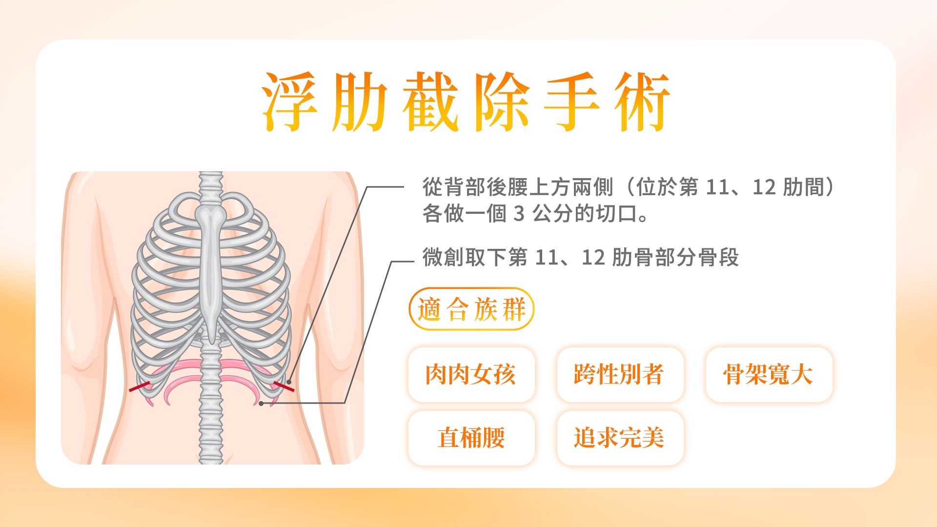 透過在背部後腰上方各做一個3公分的切口,以微創方式進入背部肌肉,剝離肋骨上的骨膜,再部分截除並取出浮肋,僅切斷影響身形的橫向部分,最後將所有分開的軟組織層縫合,根據術前胸腔X光的指引,手術將精確且細心保護肋骨以外的器官或組織,手術後需要穿束身衣施加壓力固定,以有助於體形的重塑。
