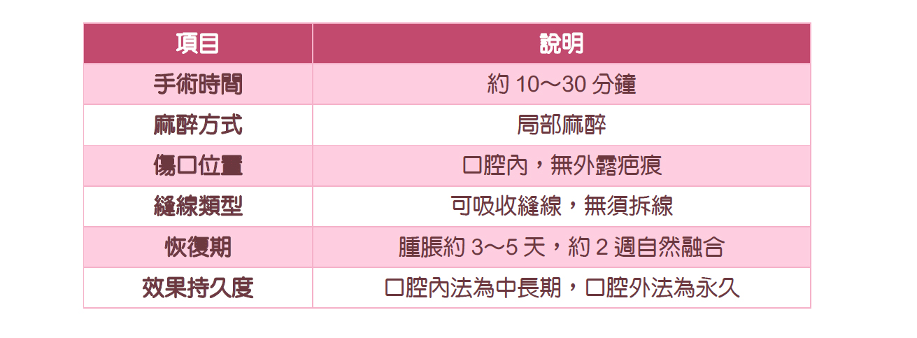 A3:若採可逆式口腔內手術法,日後可選擇調整或去除效果;口腔外法則為永久性。