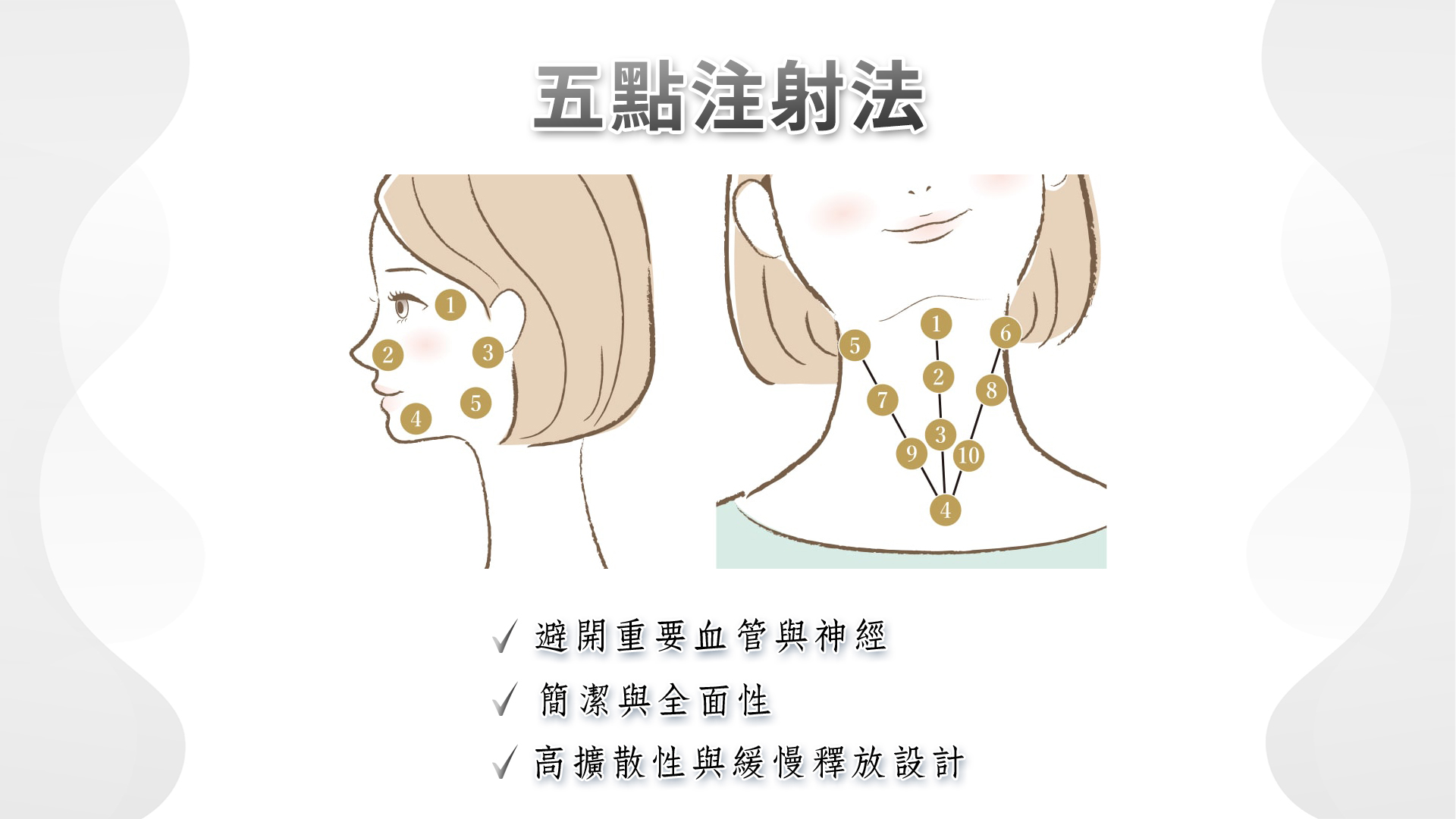 這種方法同樣適用於頸部注射,常見做法為頸部 10 點注射,協助改善頸紋與鬆弛問題。
